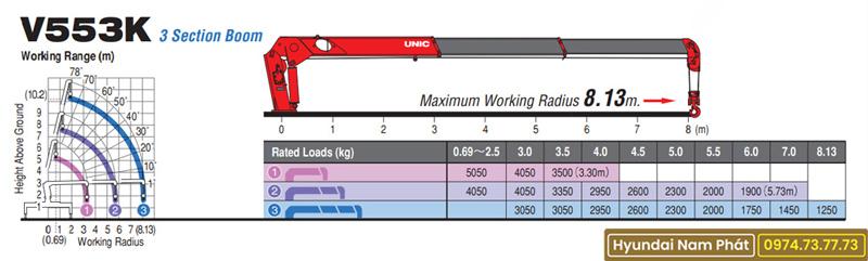 Xe sở hữu thế hệ cẩu Unic 553, là dòng cẩu 5 tấn của Unic được sản xuất theo tiêu chuẩn của dòng “V-Series” gồm các dòng cẩu Unic 5 tấn 3 khúc – Unic V 553, Unic 5 tấn 4 khúc – Unic V554, Unic 5 tấn 5 khúc – Unic 555. Cẩu Unic 553 có sức nâng lớn nhất/tầm với theo thiết kế là 5050 kg/2,2 m và 1250 kg/8,13 m. Tất cả các dòng cẩu của Unic đều sở hữu khả năng vận hành mạnh mẽ, chất lượng, bền bỉ theo thời gian, tạo được niềm tin và ưa chuộng từ khách hàng.